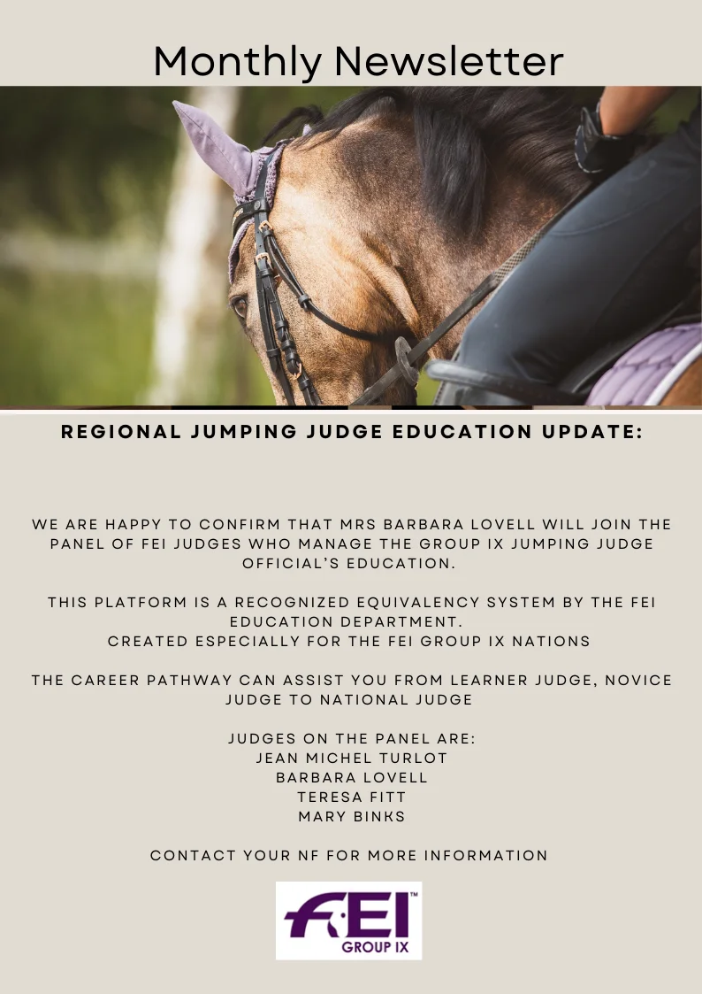 FEI GROUP IX NATIONAL EQUESTRIAN FEDERATIONS Latest News Regional Jumping Judge Education Update Regional Endurance Talent ID l Education FEI Campus FEI Clean Sport Inter Group Invitations